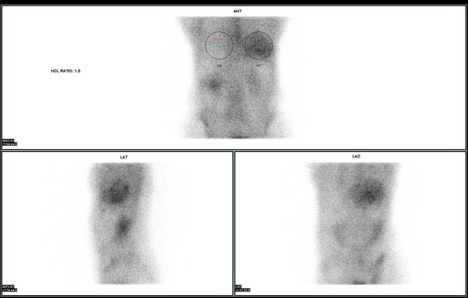 ratio of 1.5 and a Grade III visual score. The patients history was syncope, atrial fibrillation, and heart failure.